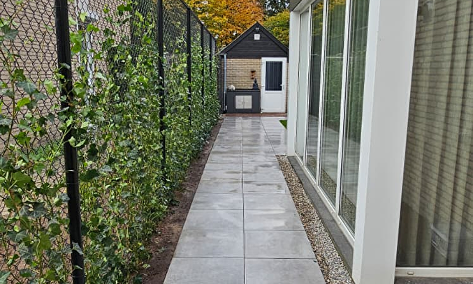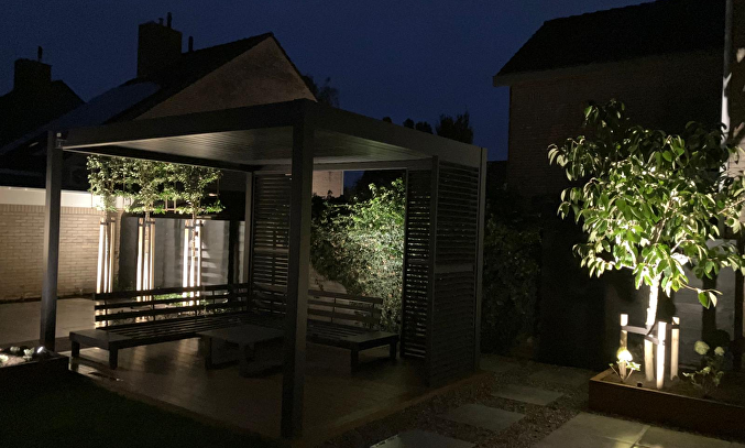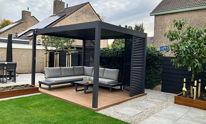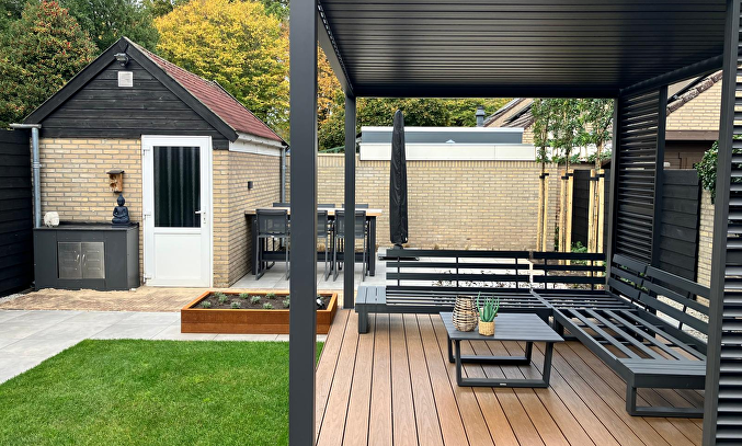 Deze elegante tuin in Venray is vormgegeven met een tijdloos karakter. De gekozen materialen en warme kleurtinten creëren een moderne, maar tegelijkertijd sfeervolle uitstraling, waarbij voldoende ruimte is behouden voor natuurlijke beplanting. Een echte blikvanger in deze tuin is de aluminium overkapping: een strak afgewerkt, antracietkleurig model met een handmatig bedienbaar dak. Hiermee kan eenvoudig worden gekozen voor meer of minder beschutting, afhankelijk van het weer.