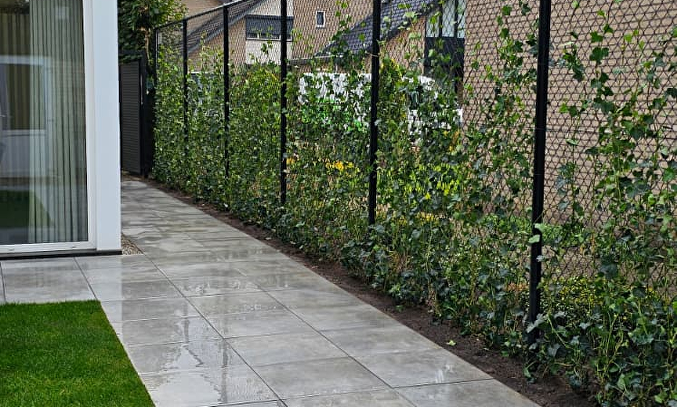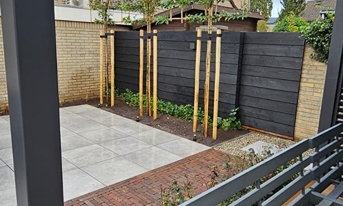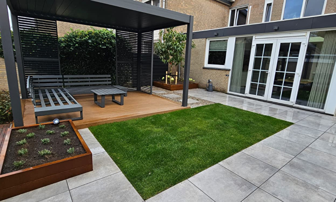 Daarnaast is de tuin aangelegd met verschillende duurzame materialen, zoals keramische tegels, een composiet vlonder, grind en cortenstalen plantenbakken. Deze combinatie zorgt voor een speels en gevarieerd geheel dat zowel functioneel als esthetisch sterk in balans is. Alle toegepaste materialen zijn onderhoudsarm en staan garant voor een lange levensduur, zodat de tuin nog jarenlang zijn mooie uitstraling behoudt. Naast duurzaam is de tuin ook nog eens onderhoudsarm, zonder de tuin volledig te verharden.