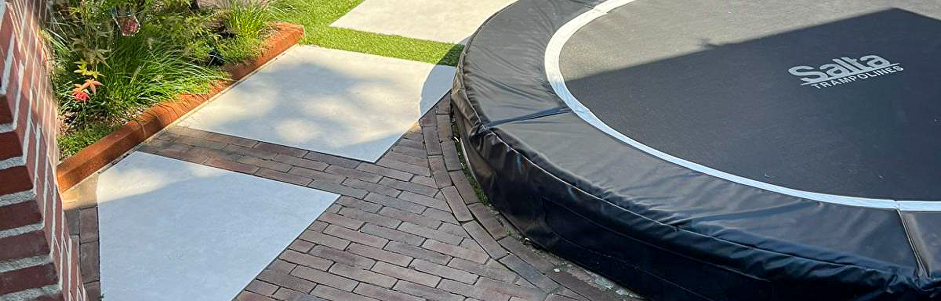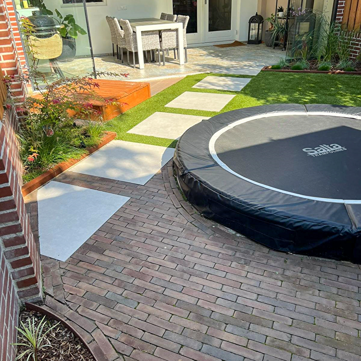 Door slim om te gaan met de beschikbare oppervlakte is er een natuurlijke balans ontstaan tussen bestrating, groen en zelfs nog voldoende speelgelegenheid voor de kinderen. Wat deze tuin bijzonder maakt, zijn de toegepaste schuine lijnen. In plaats van rechte paden en strakke hoeken is gekozen voor diagonale bestrating en speelse, schuine overgangen tussen terras en beplanting. Deze lijnen doorbreken de vaste contouren. Het resultaat is een optische verruiming: de tuin lijkt groter dan hij in werkelijkheid is.