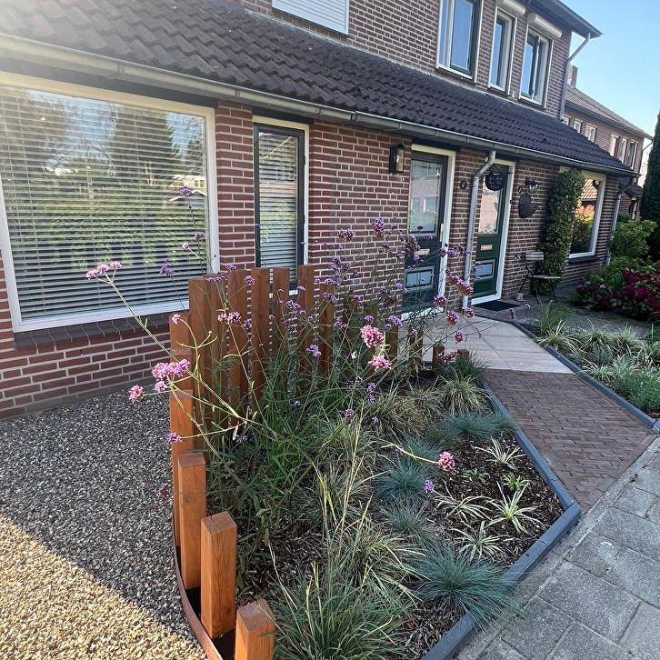 Maar ook de voortuin mag niet achterblijven. Ook hier is gebruik gemaakt van diverse kleur combinaties voor een sfeervol geheel!